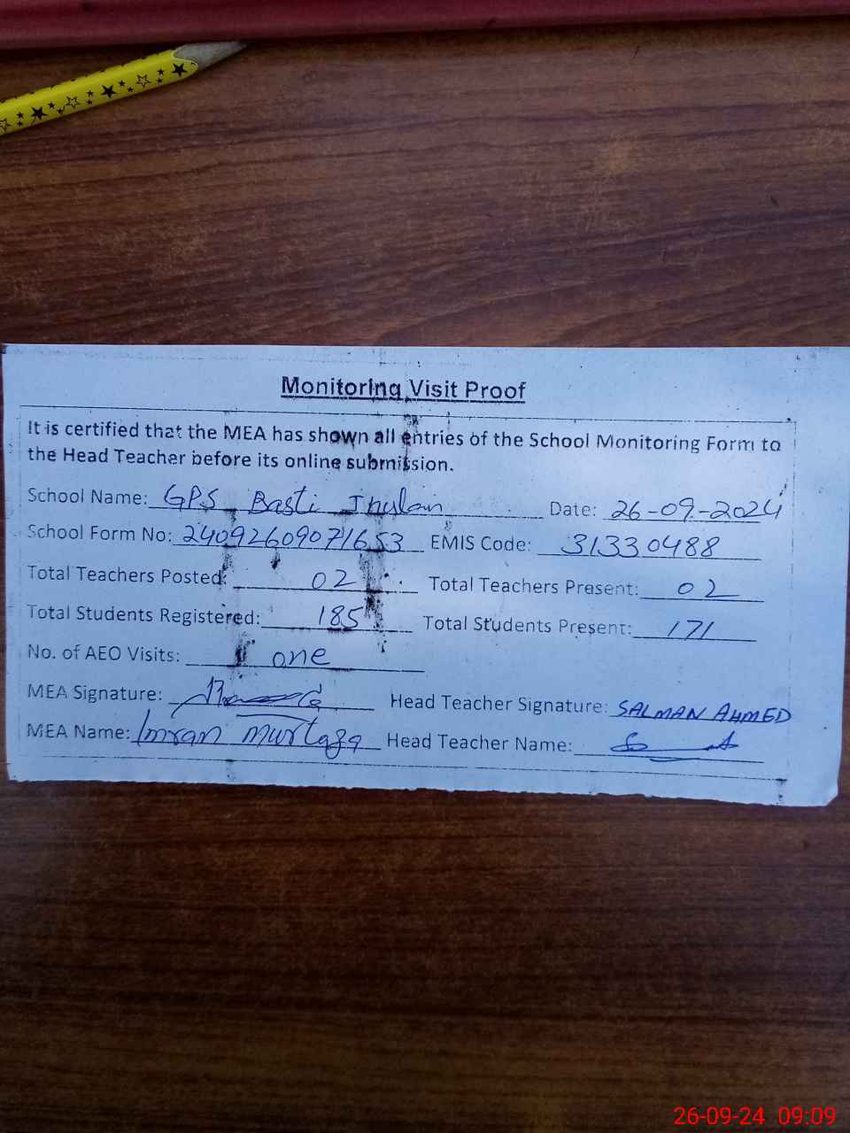 | Attendance Register | Head Teacher | MEA with School | Visit Proof |