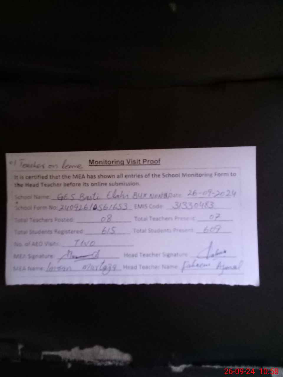 | Attendance Register | Head Teacher | MEA with School | Visit Proof |