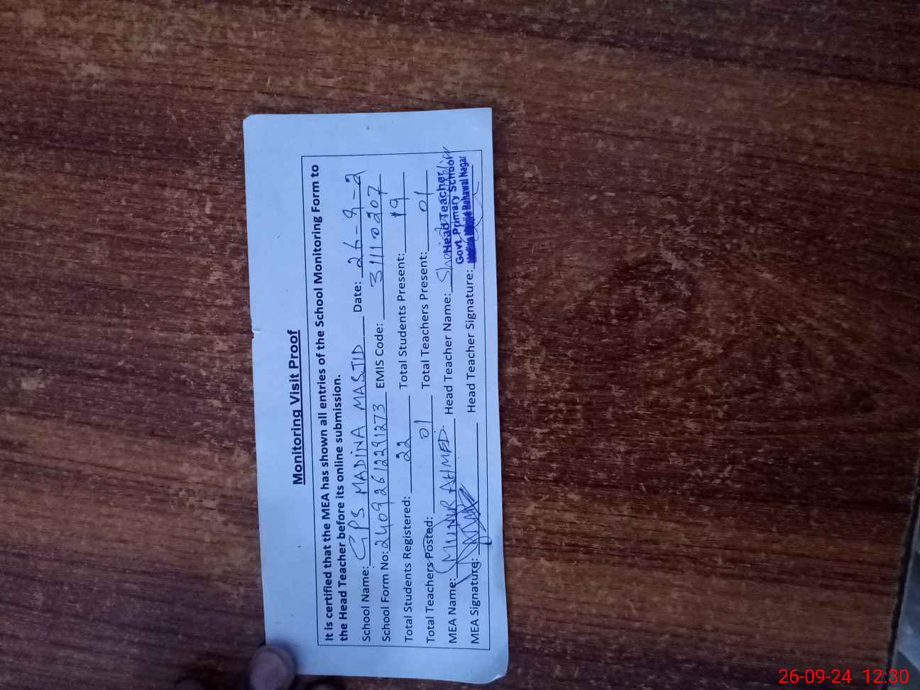 | Attendance Register | Head Teacher | MEA with School | Visit Proof |