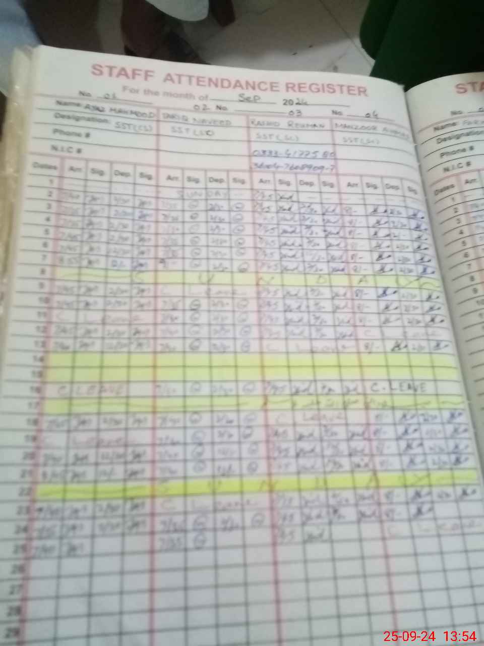 | CNIC | Full Name | Designation | R/C | Absence during last cal. month |
