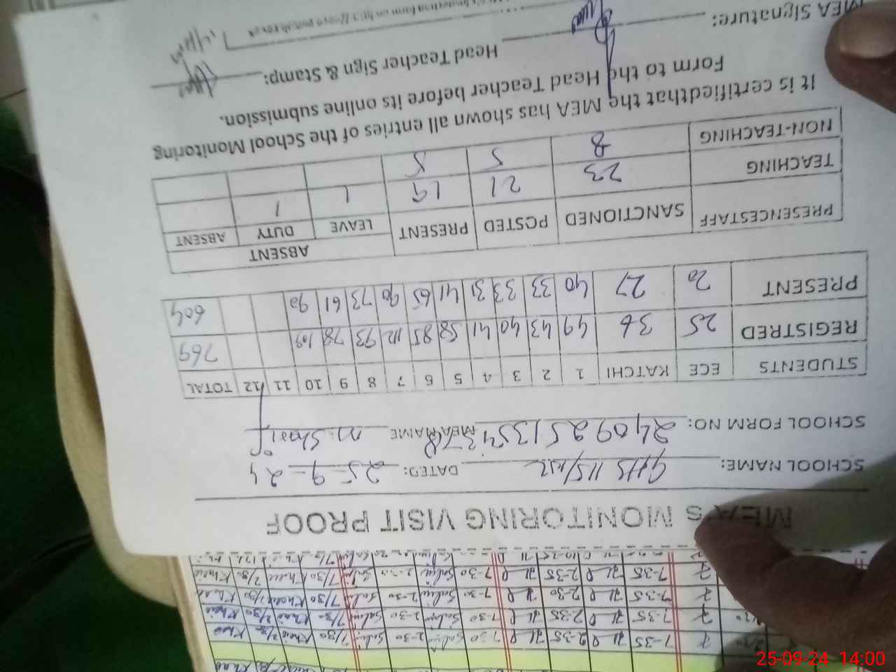 | Attendance Register | Head Teacher | MEA with School | Visit Proof |