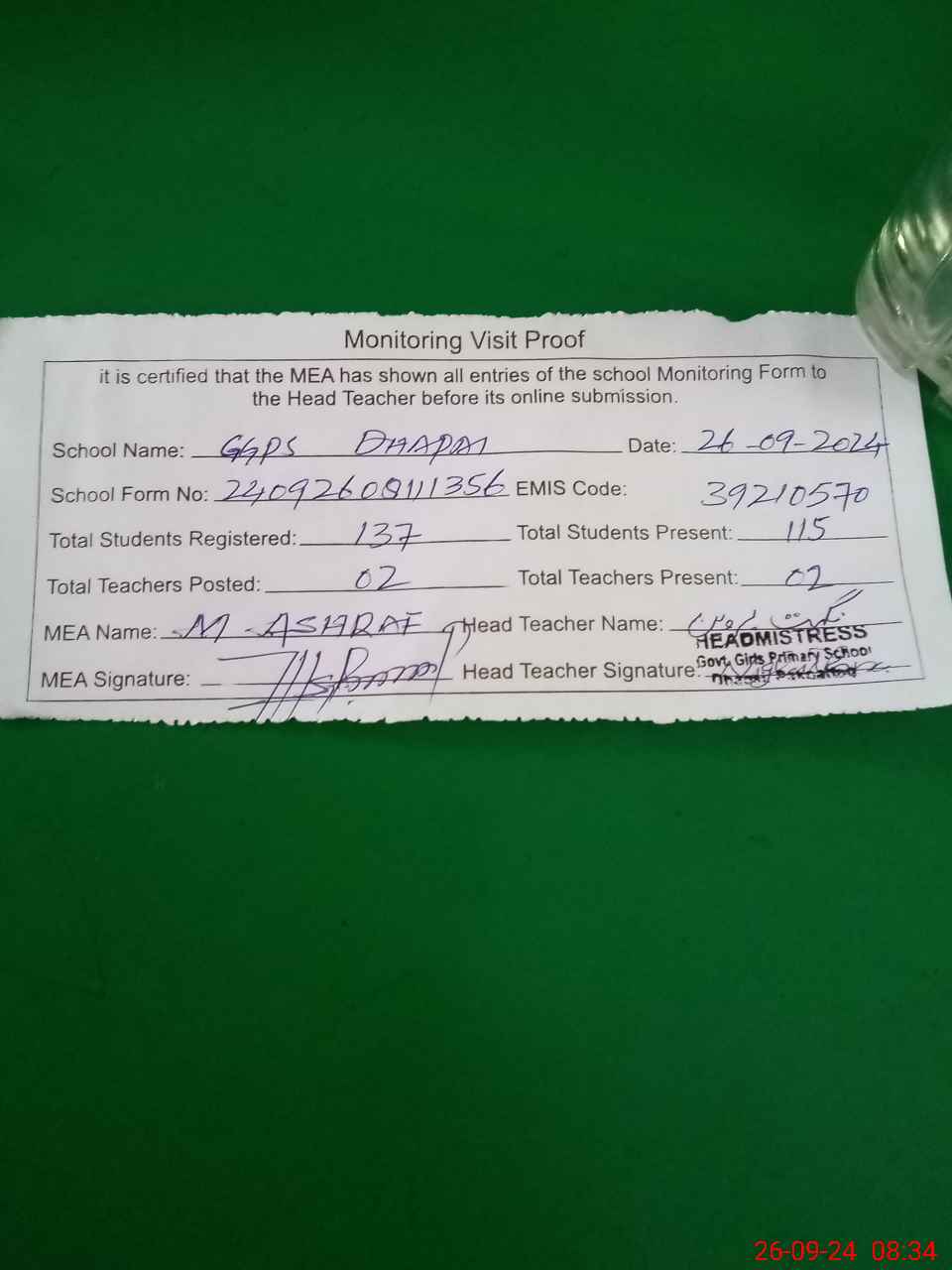 | EMIS Code: 39210570 | Name of School: GGPS DHAPAI | |||