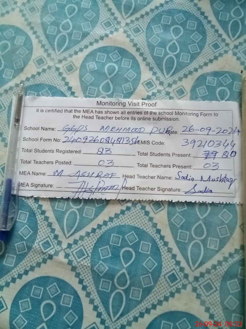 | Attendance Register | Head Teacher | MEA with School | Visit Proof |