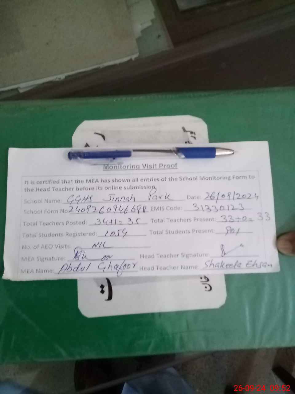 | Certified that this School was Inspected by the Undersigned MEA/DMO Today and the Information Stated Above is as Per Record. | |||||