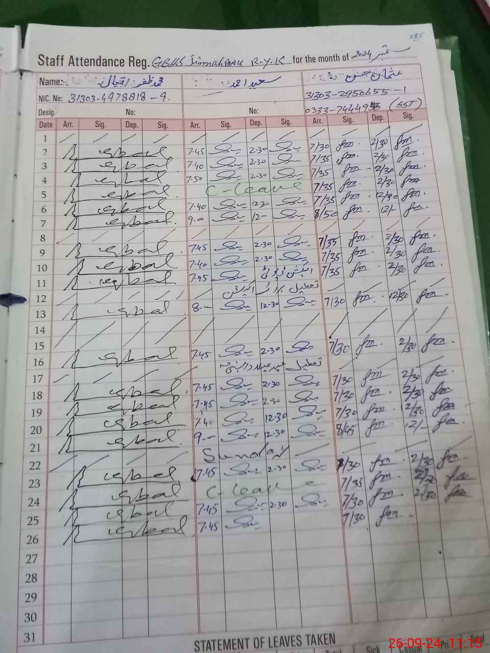 | CNIC | Full Name | Designation | R/C | Absence during last cal. month |