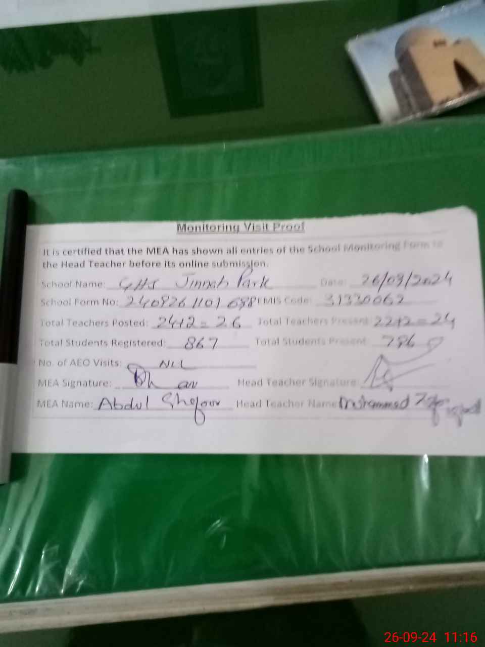 | Attendance Register | Head Teacher | MEA with School | Visit Proof |