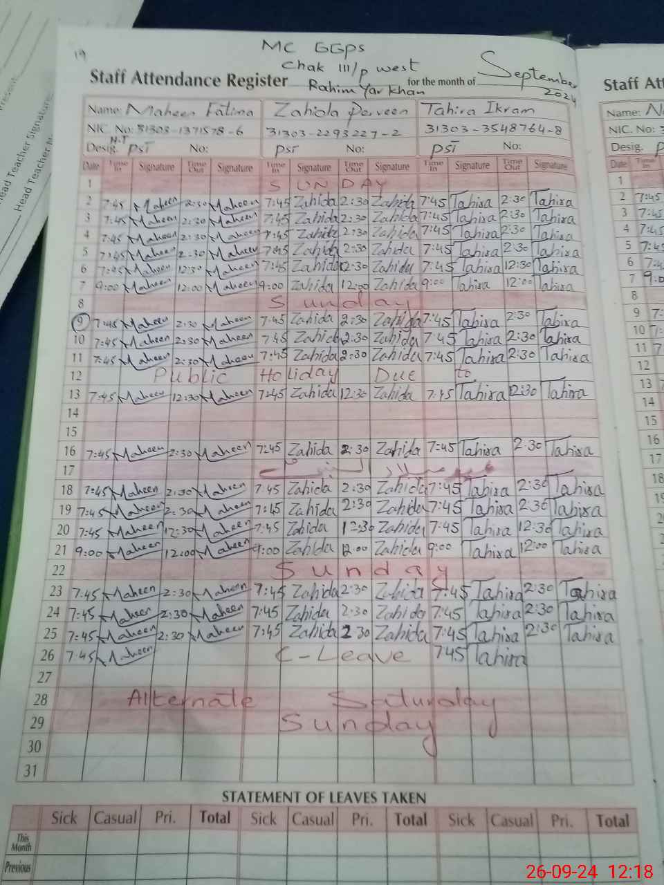 | CNIC | Full Name | Designation | R/C | Absence During Last Calender Month |