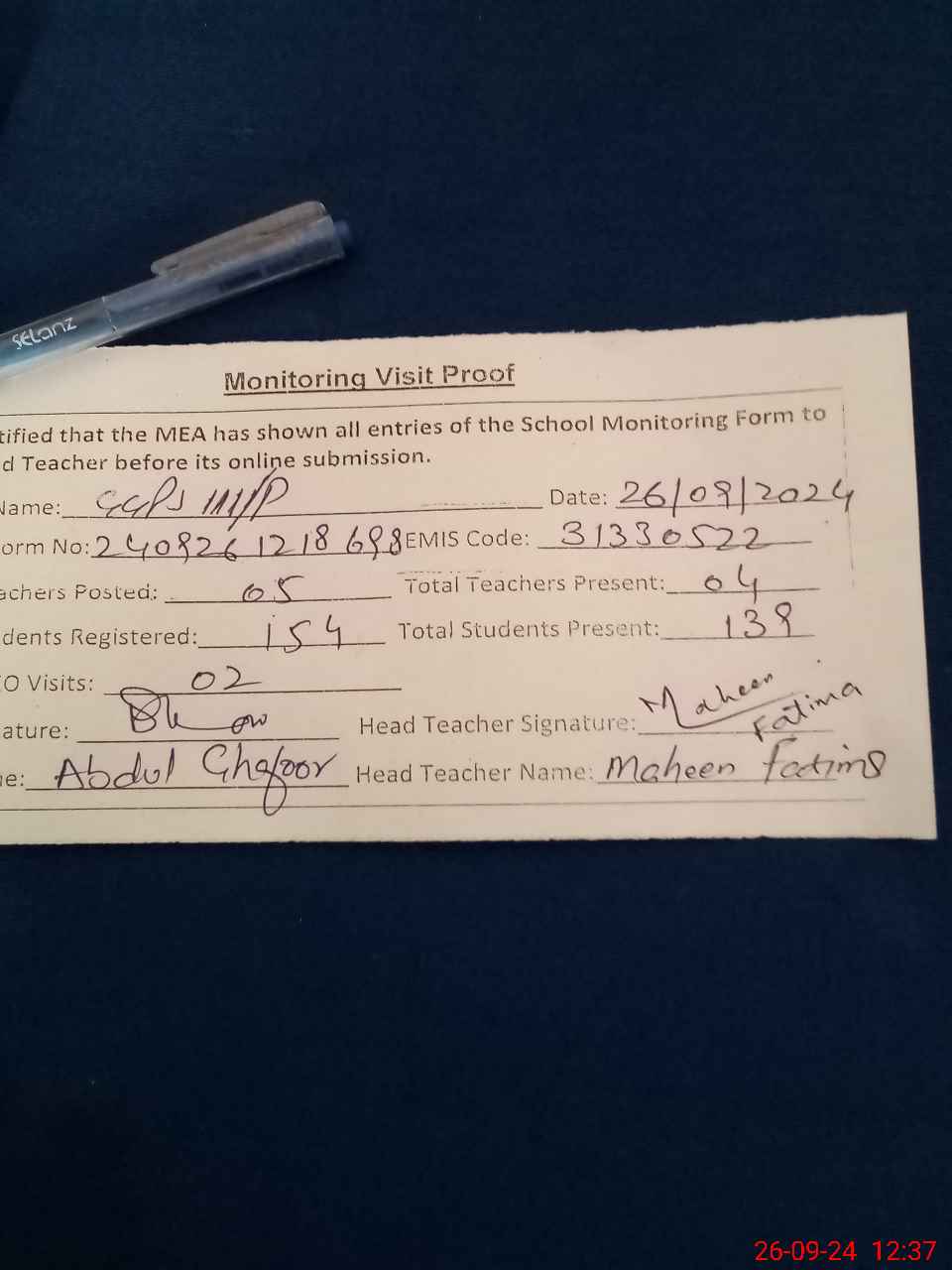 | Attendance Register | Head Teacher | MEA with School | Visit Proof |