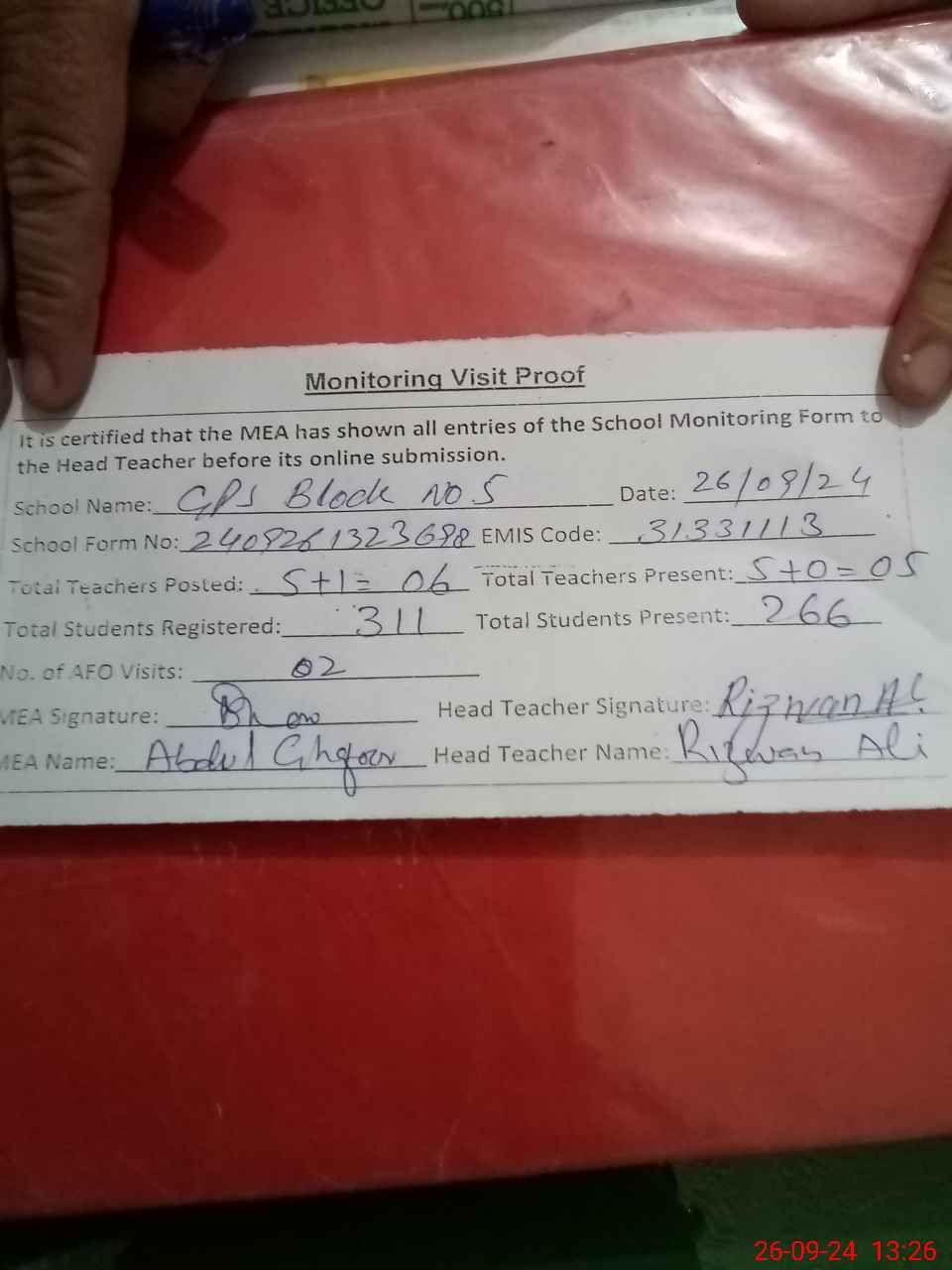 | EMIS Code: 31331113 | Name of School: GPS MC BLOCK NO. 5 INHAR COLONY | |||
