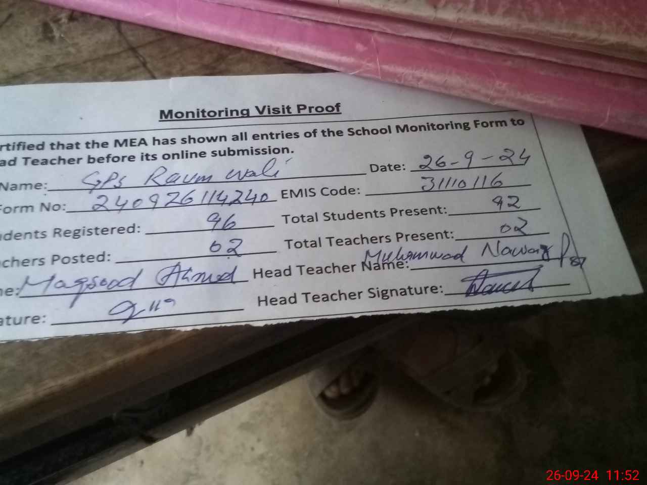 | Attendance Register | Head Teacher | MEA with School | Visit Proof |