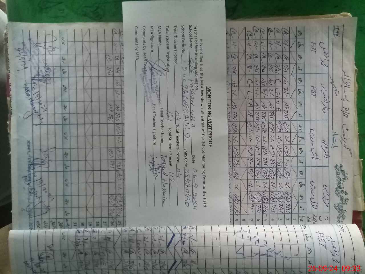 | Attendance Register | Head Teacher | MEA with School | Visit Proof |