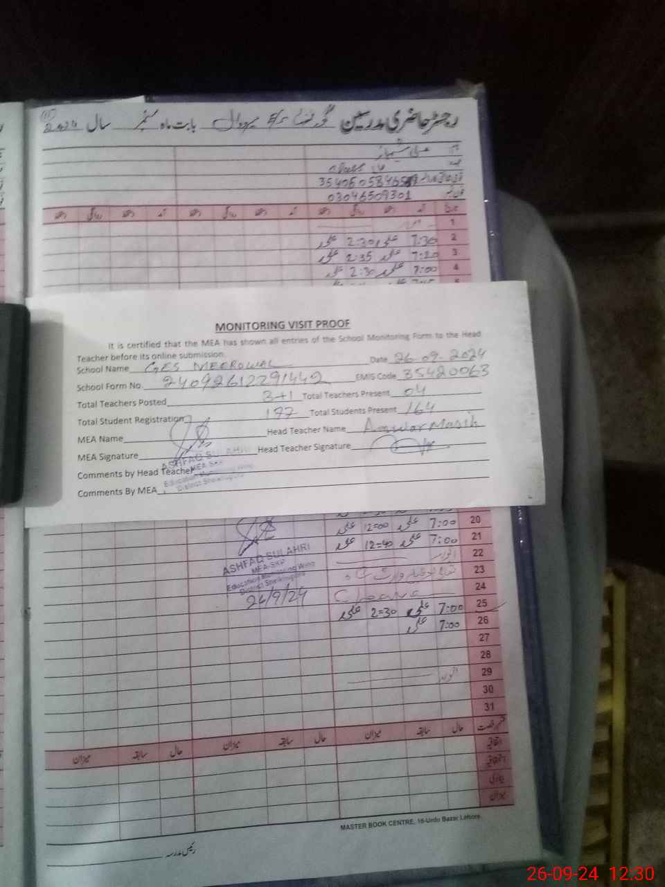 | Attendance Register | Head Teacher | MEA with School | Visit Proof |