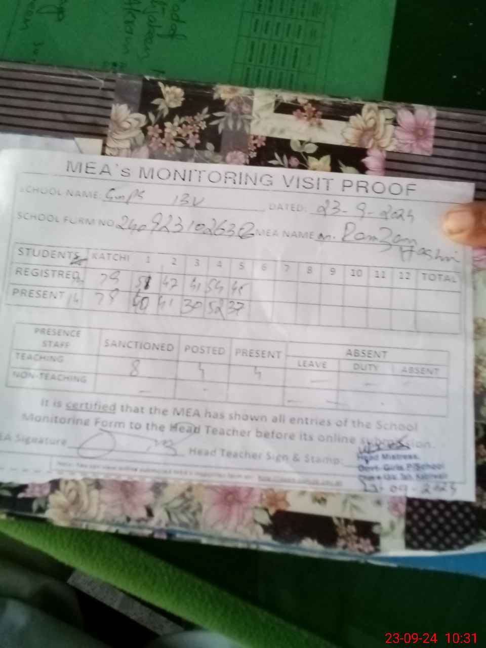 | Attendance Register | Head Teacher | MEA with School | Visit Proof |