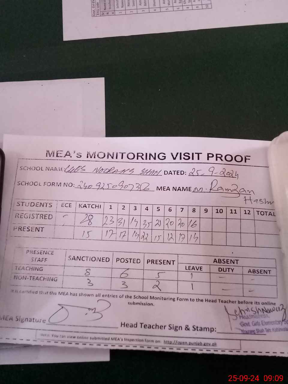 | Attendance Register | Head Teacher | MEA with School | Visit Proof |