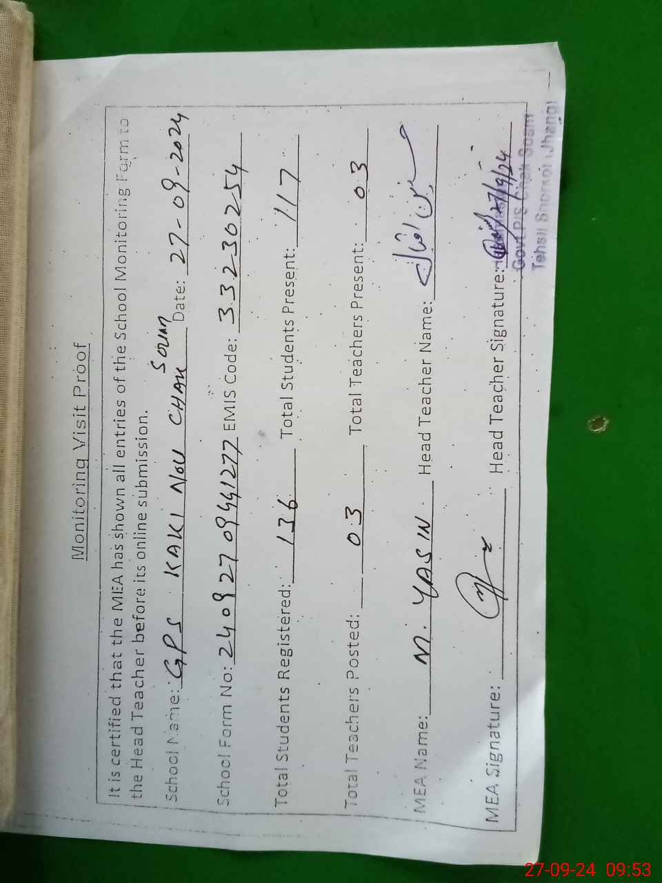 | Attendance Register | Head Teacher | MEA with School | Visit Proof |