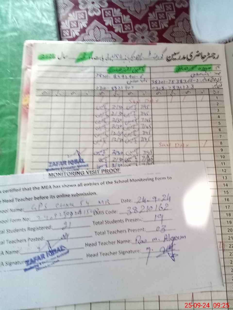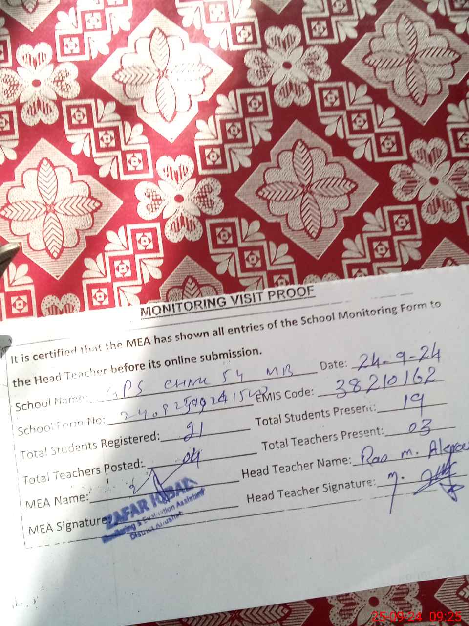 | Attendance Register | Head Teacher | MEA with School | Visit Proof |