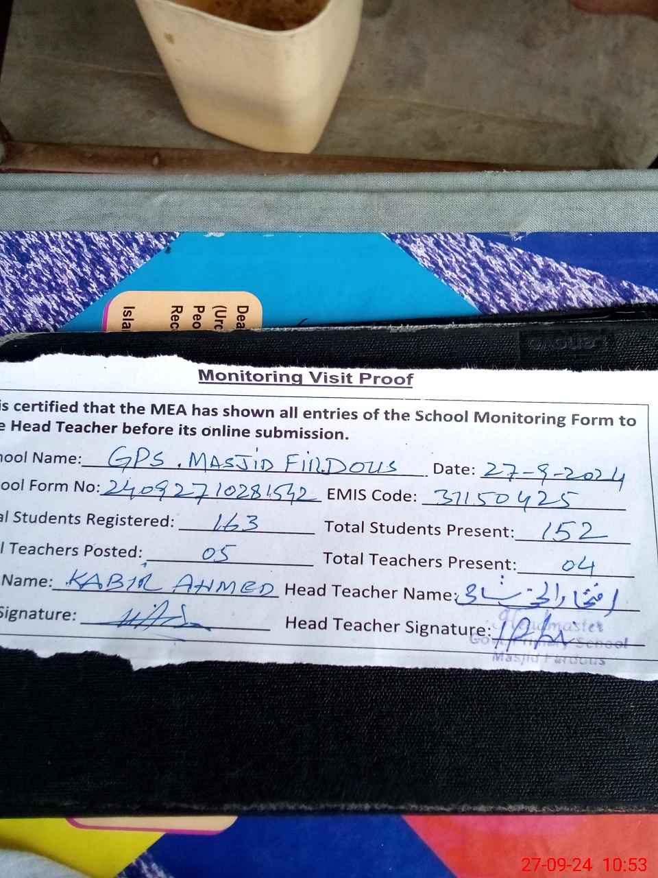| Attendance Register | Head Teacher | MEA with School | Visit Proof |