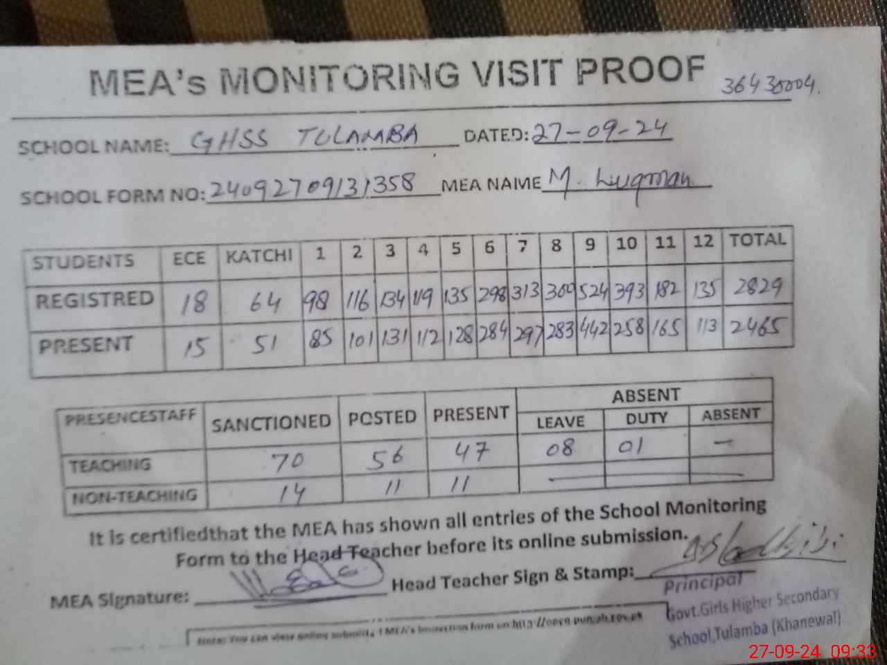 | Attendance Register | Head Teacher | MEA with School | Visit Proof |