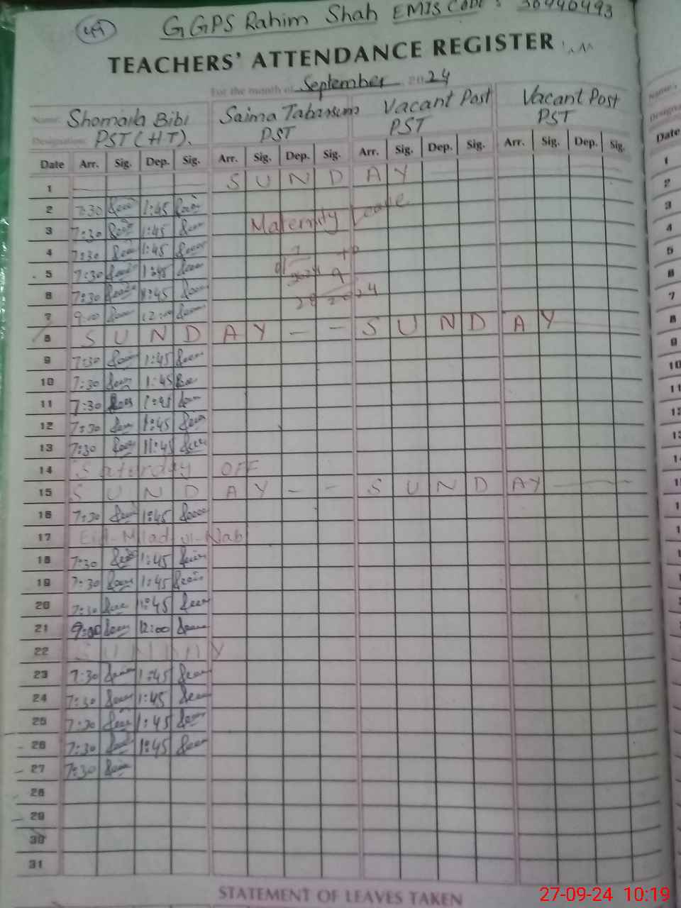 | 36**** | Sa**** Ta**** | PST | Regular | 0 | 0 | 0 | 0 | 0 | 0 | 0 | 0 | 0 | Maternity |