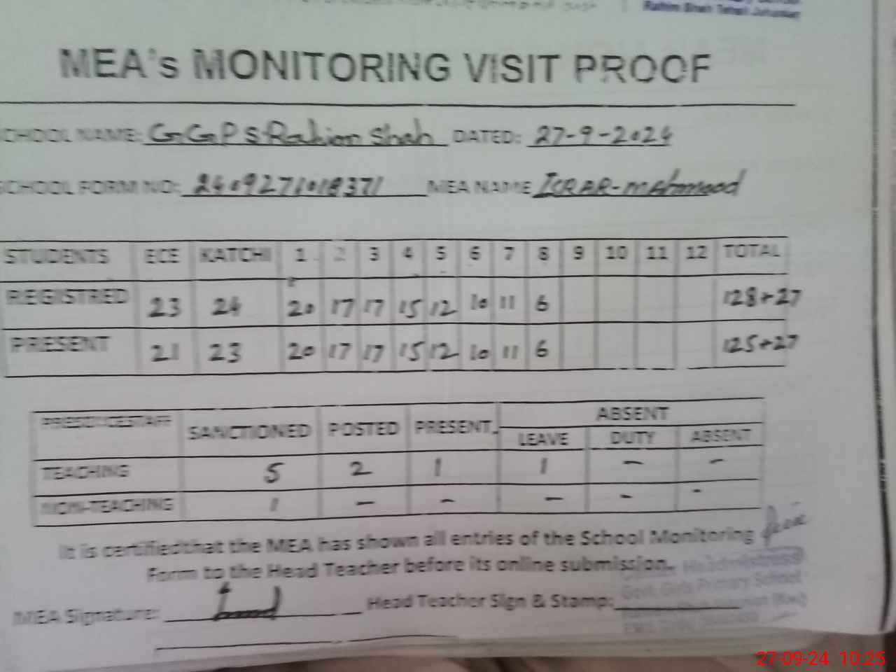 | Attendance Register | Head Teacher | MEA with School | Visit Proof |