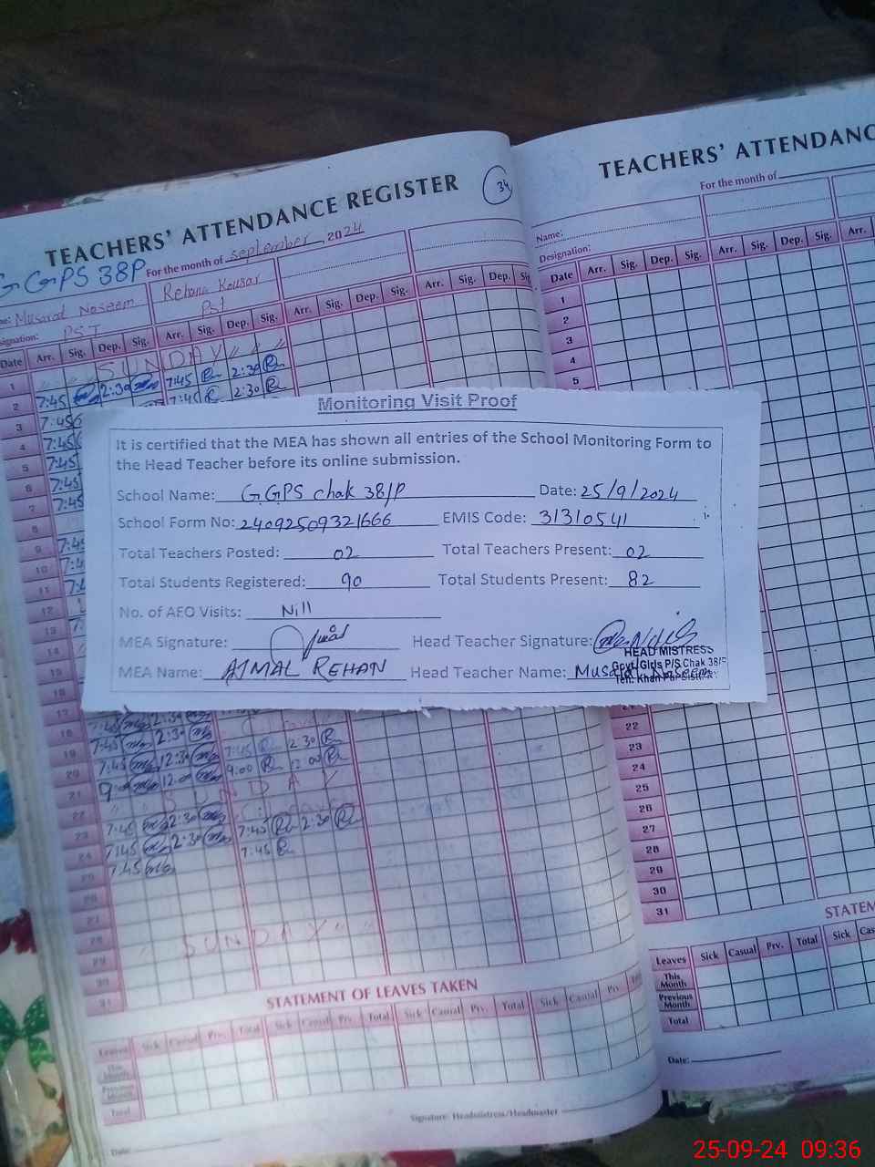 | Attendance Register | Head Teacher | MEA with School | Visit Proof |