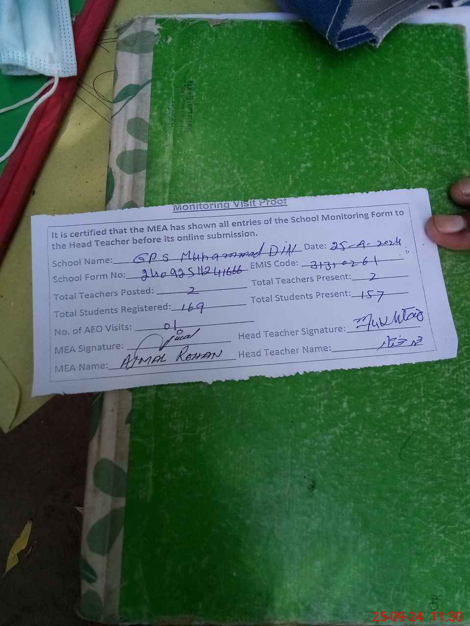 | Attendance Register | Head Teacher | MEA with School | Visit Proof |