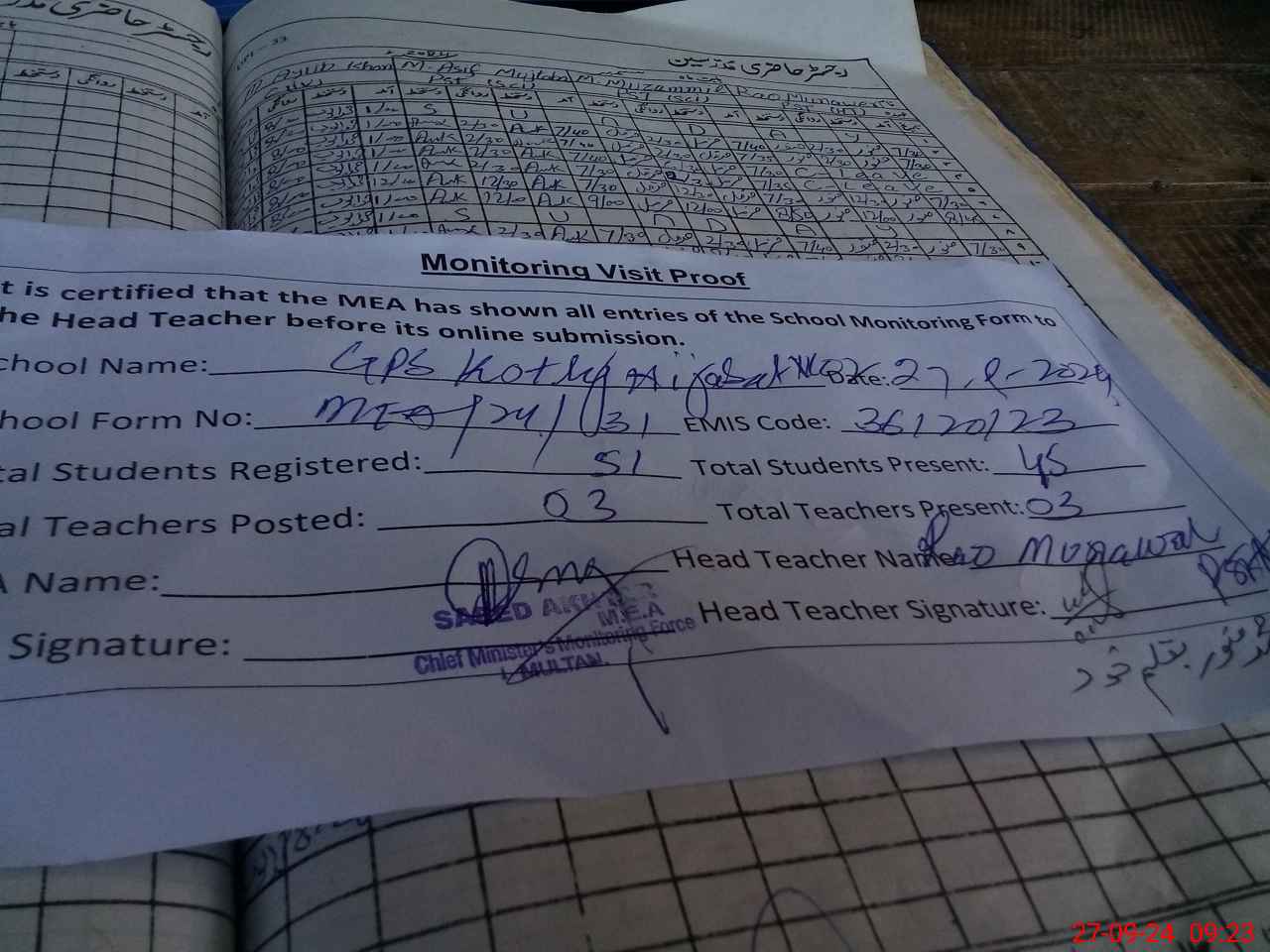 | Attendance Register | Head Teacher | MEA with School | Visit Proof |