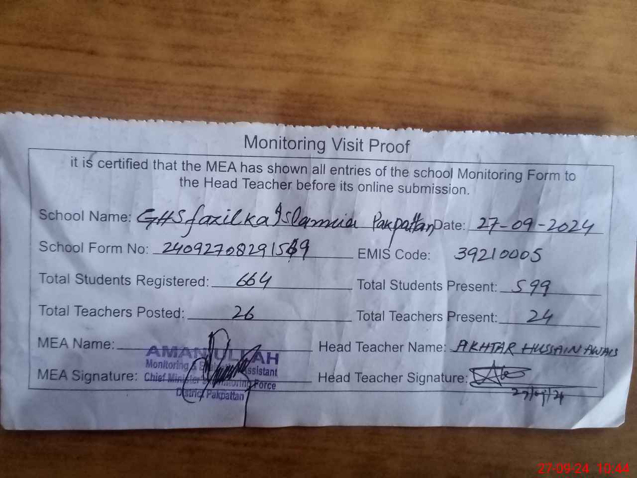 | Monitoring Date: 27-09-2024 | Start Time: 27-09-2024 08:29 AM | End Time: 27-09-2024 11:02 AM | Name of MEA: AM**** UL**** | |