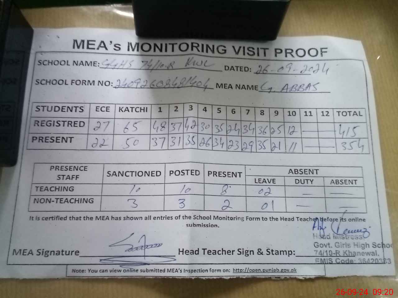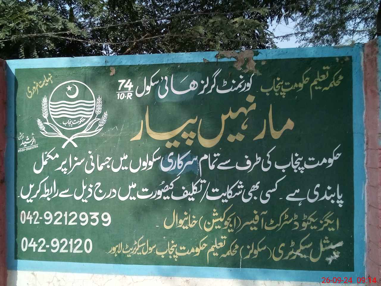 | EMIS Code: 36420383 | Name of School: GGHS 74/10-R, KHANEWAL | |||