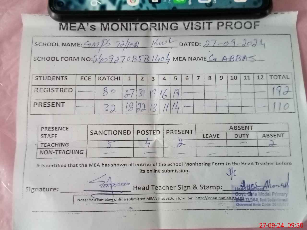 | Attendance Register | Head Teacher | MEA with School | Visit Proof |