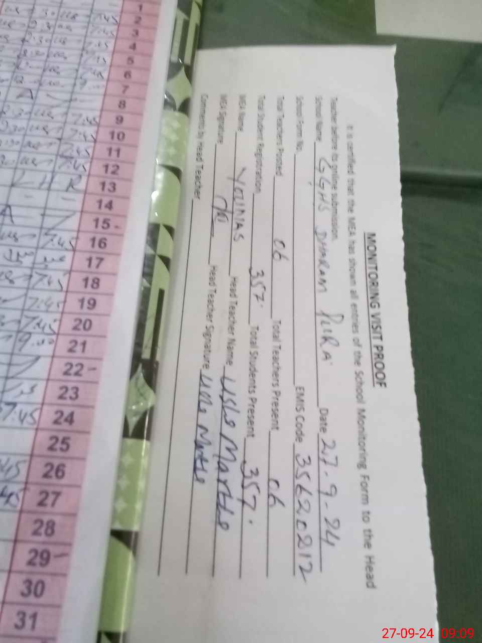 | Attendance Register | Head Teacher | MEA with School | Visit Proof |