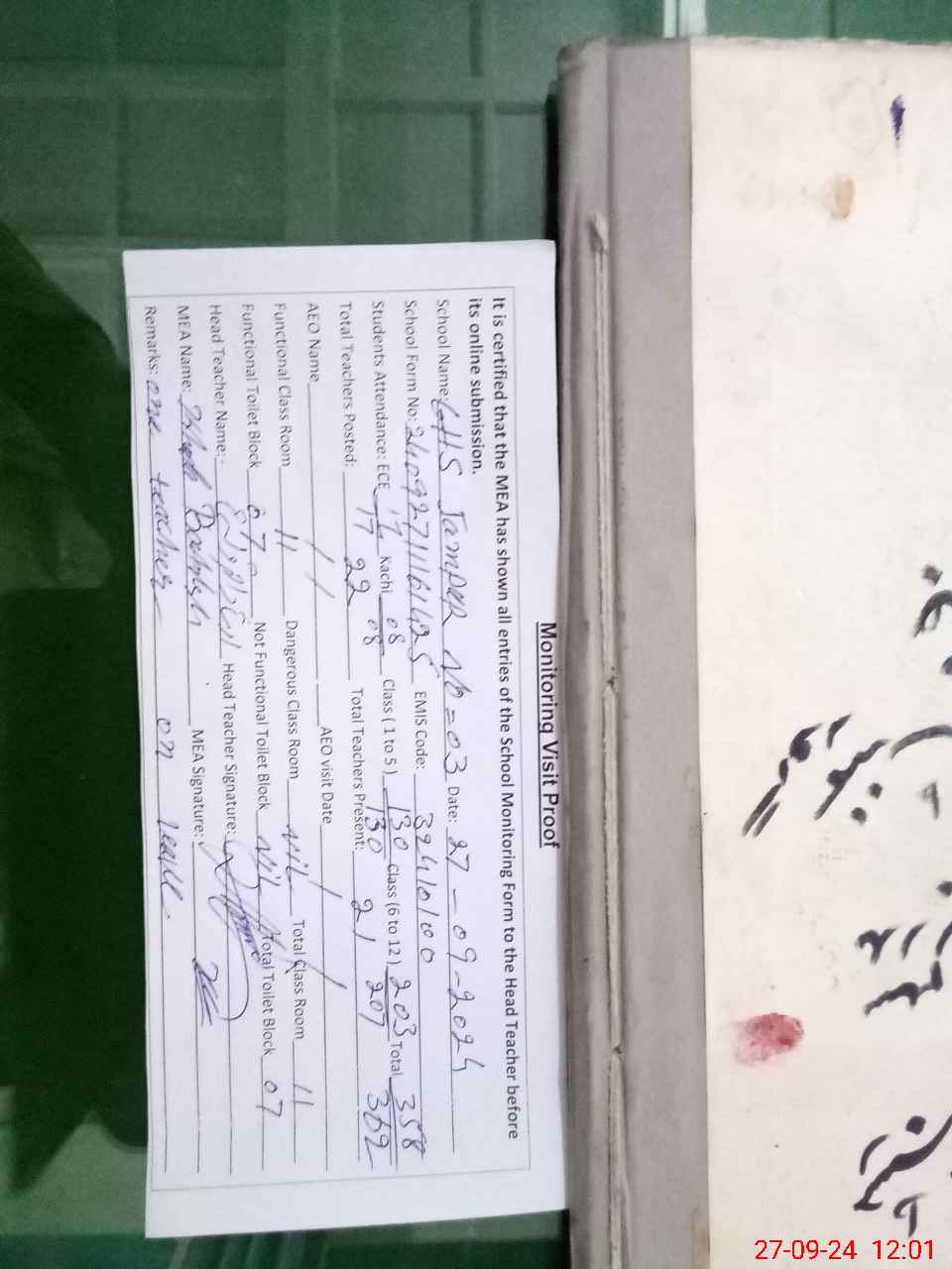 | Attendance Register | Head Teacher | MEA with School | Visit Proof |