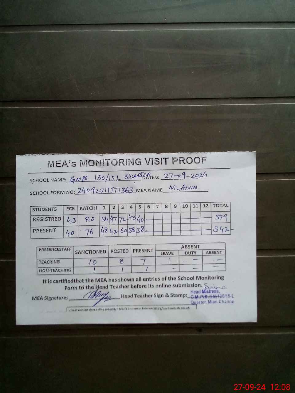 | Attendance Register | Head Teacher | MEA with School | Visit Proof |