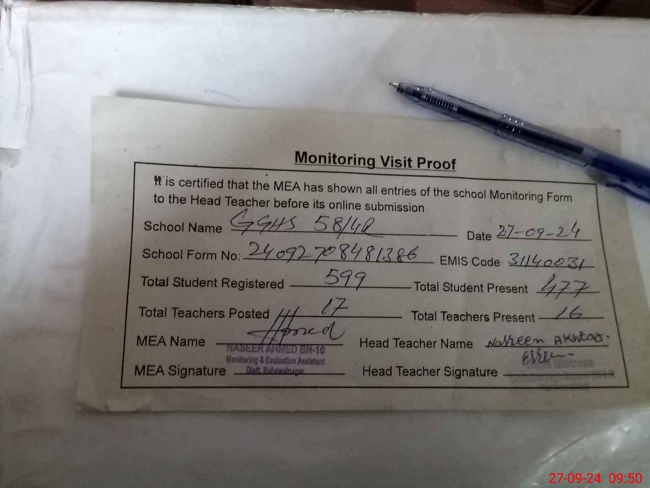 | Attendance Register | Head Teacher | MEA with School | Visit Proof |