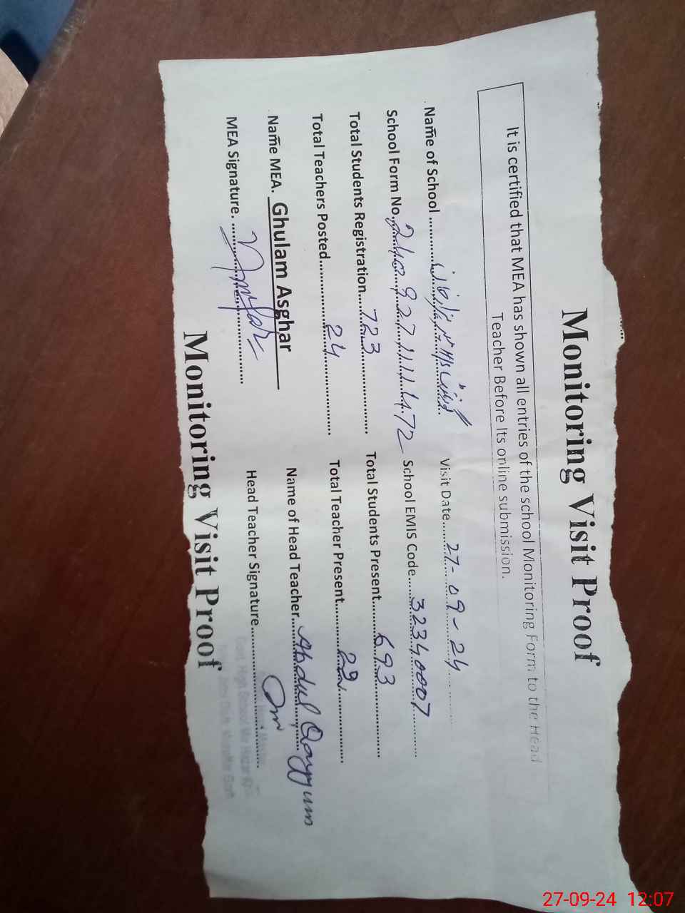 | Attendance Register | Head Teacher | MEA with School | Visit Proof |