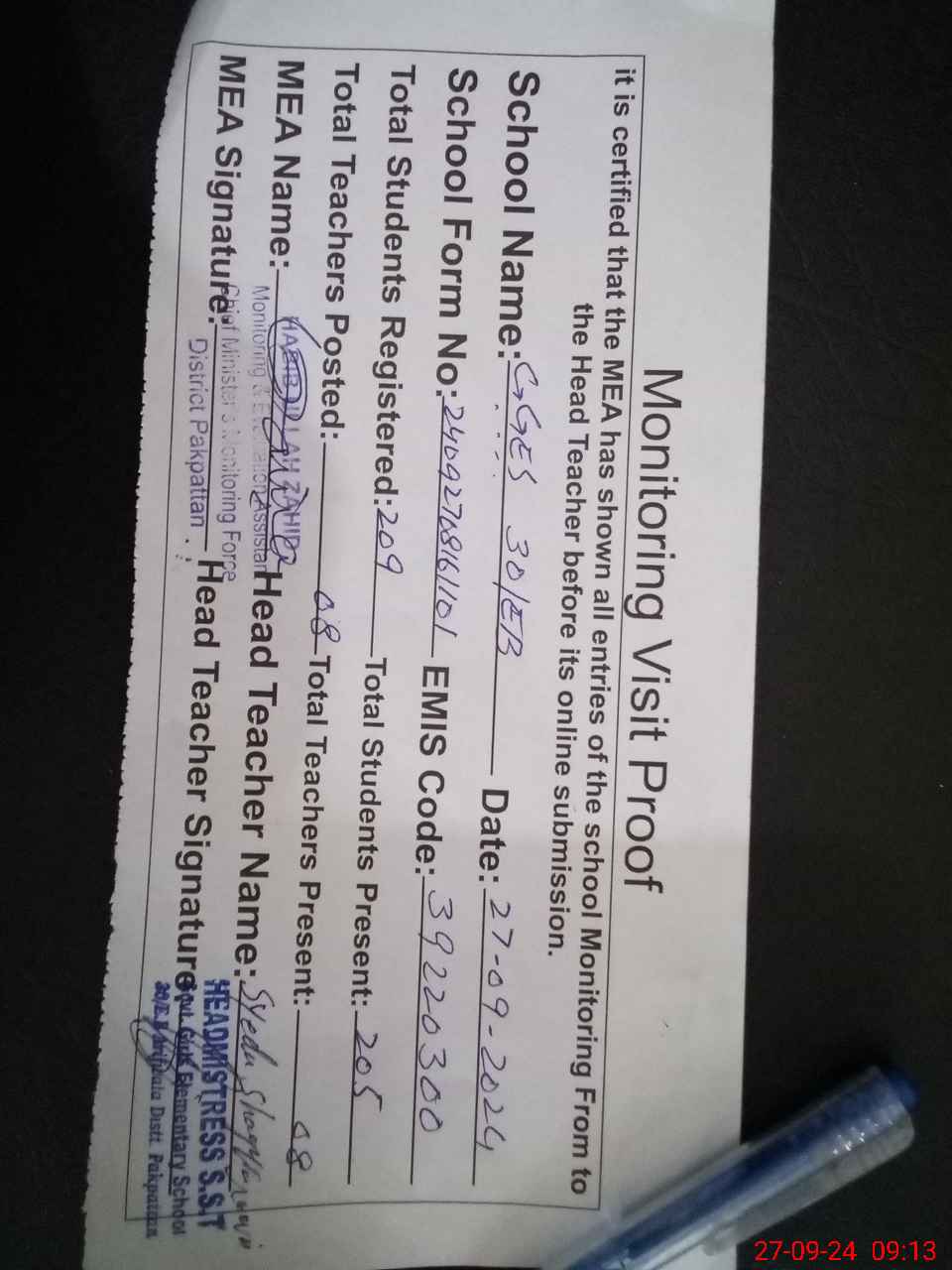 | Attendance Register | Head Teacher | MEA with School | Visit Proof |