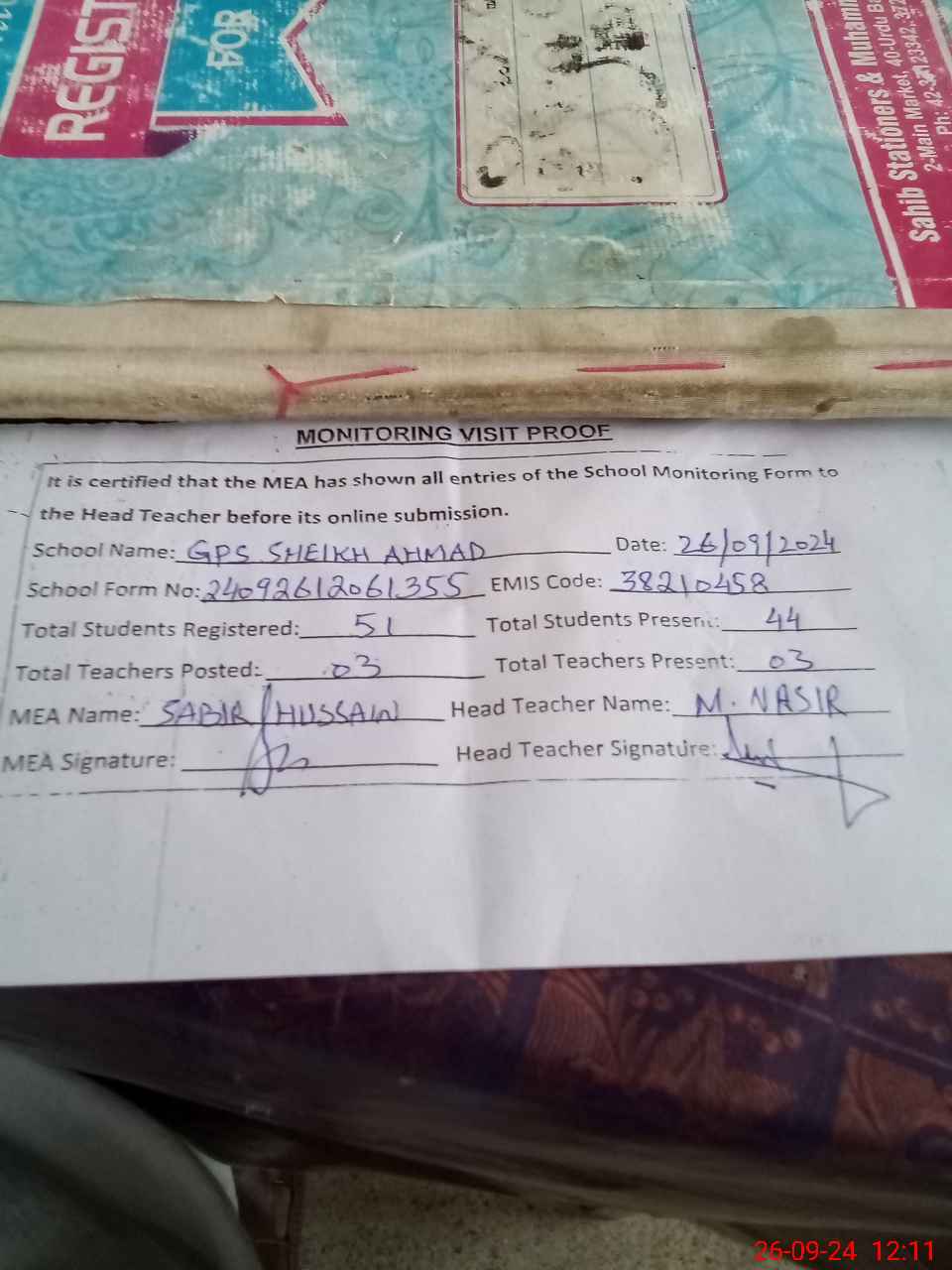 | Attendance Register | Head Teacher | MEA with School | Visit Proof |