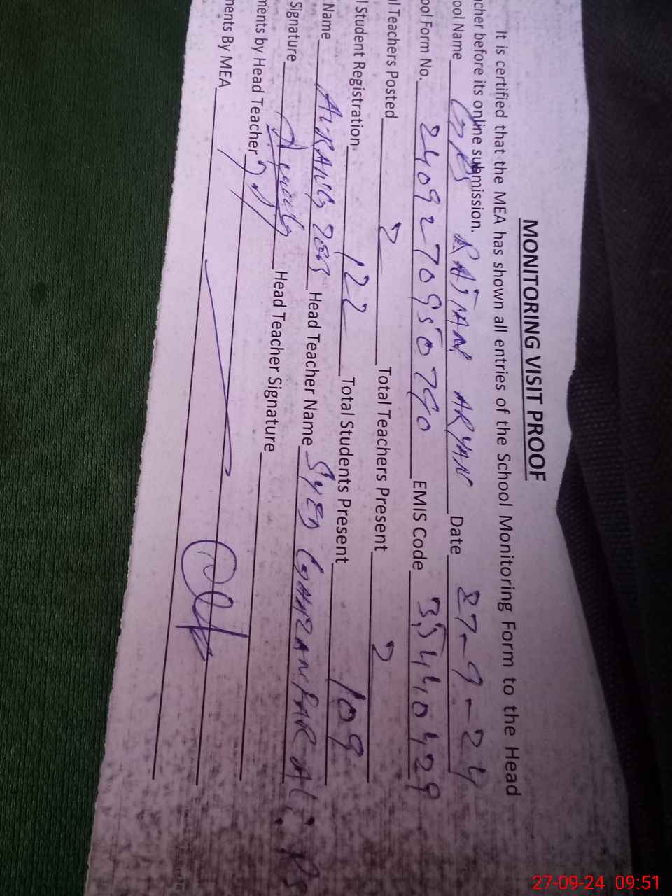 | Monitoring Date: 27-09-2024 | Start Time: 27-09-2024 09:29 AM | End Time: 27-09-2024 09:56 AM | Name of MEA: Au**** Za**** | |