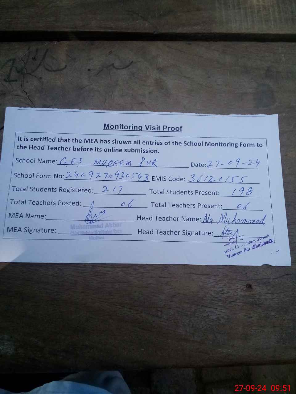 | Attendance Register | Head Teacher | MEA with School | Visit Proof |