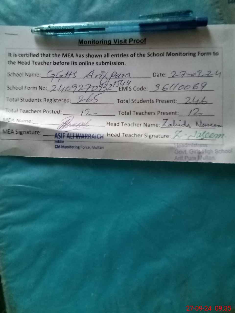 | EMIS Code: 36110069 | Name of School: GGHS ARIF PURA MULTAN | |||