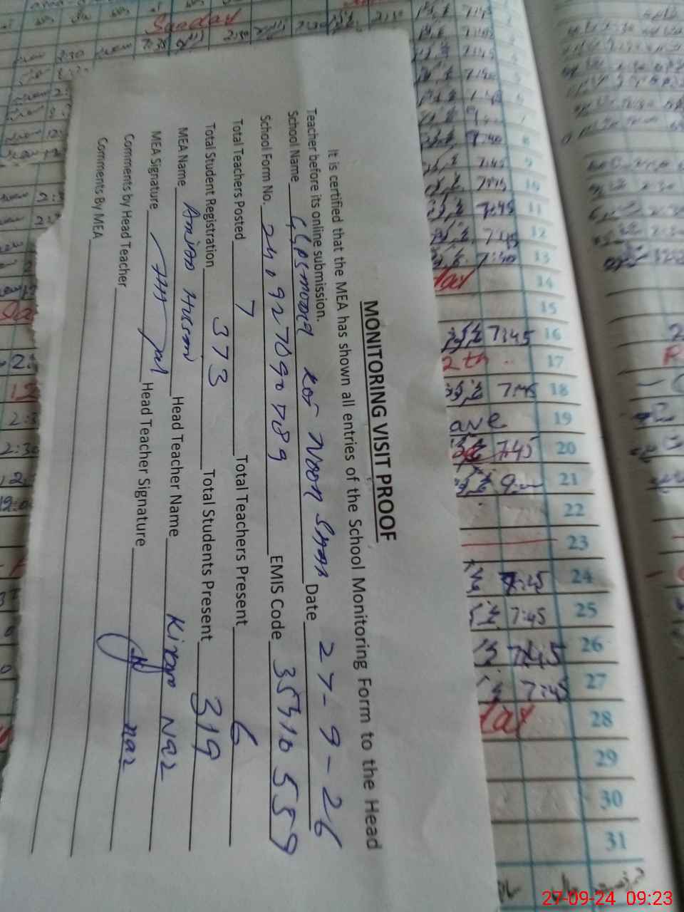 | Attendance Register | Head Teacher | MEA with School | Visit Proof |