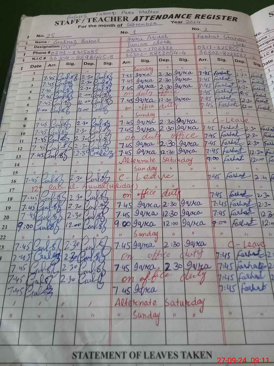 | CNIC | Full Name | Designation | R/C | Absence During Last Calender Month |