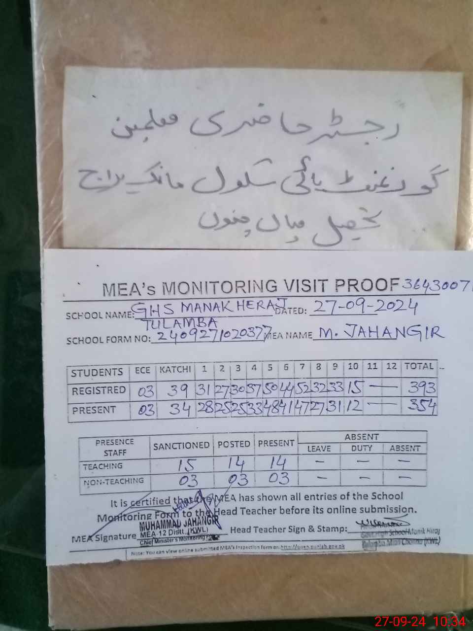 | Certified that this School was Inspected by the Undersigned MEA/DMO Today and the Information Stated Above is as Per Record. | |||||