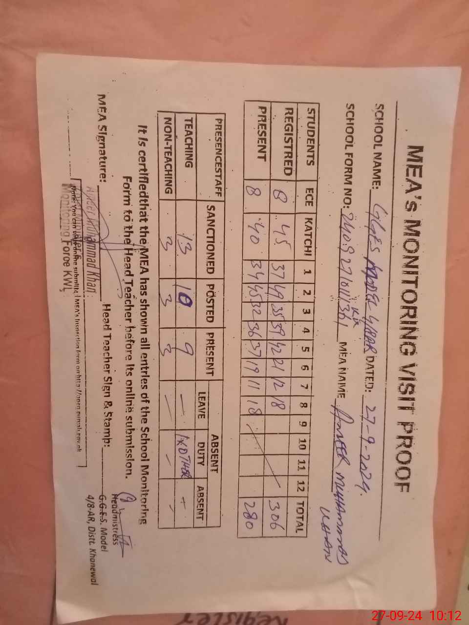 | Monitoring Date: 27-09-2024 | Start Time: 27-09-2024 09:30 AM | End Time: 27-09-2024 10:23 AM | Name of MEA: Am**** Mu**** Kh**** | |