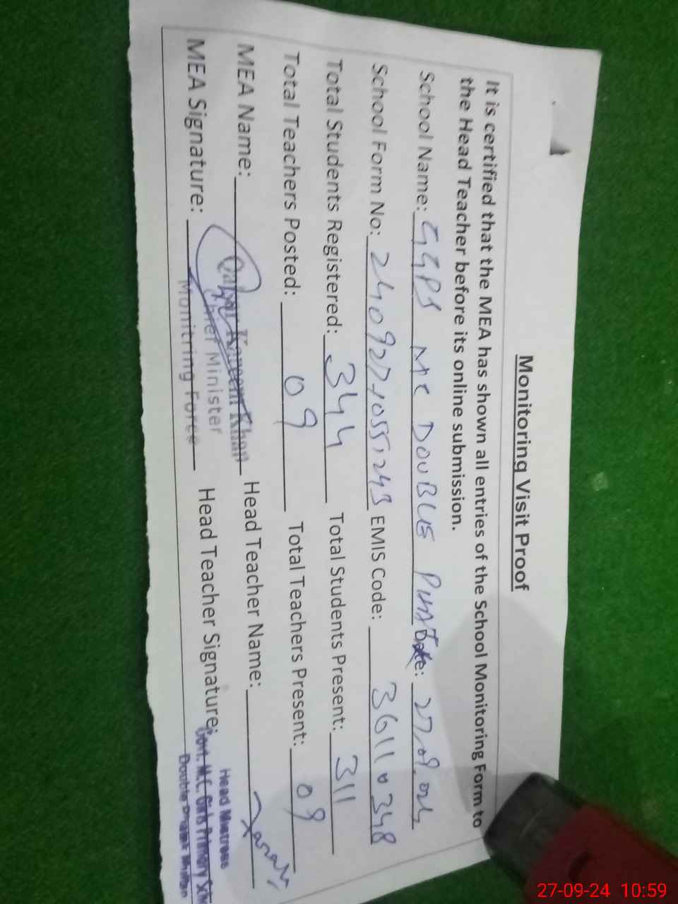 | Attendance Register | Head Teacher | MEA with School | Visit Proof |