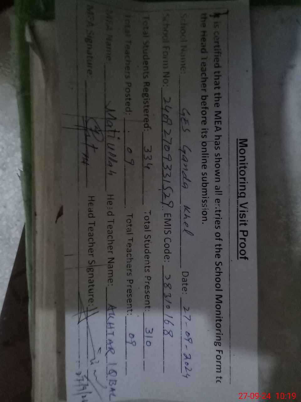 | EMIS Code: 38310168 | Name of School: GHS GANDA KHEL | |||