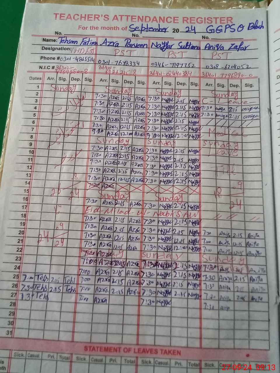 | Name: AZ**** PA**** Designation: (School Headmaster's/Headmistress's) PST Phone/Cell Number: 03**** |