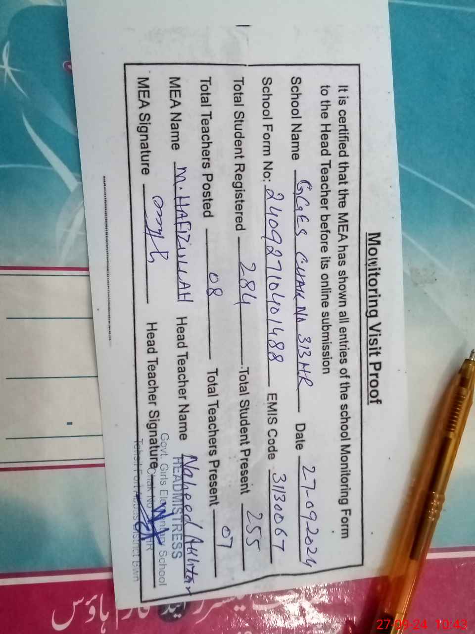 | Attendance Register | Head Teacher | MEA with School | Visit Proof |