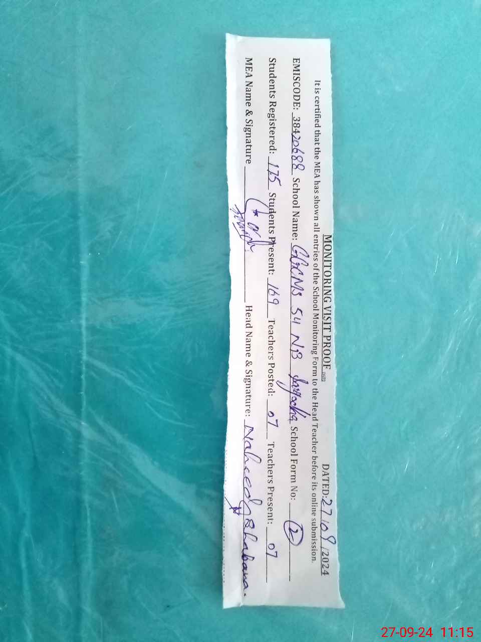 | Attendance Register | Head Teacher | MEA with School | Visit Proof |