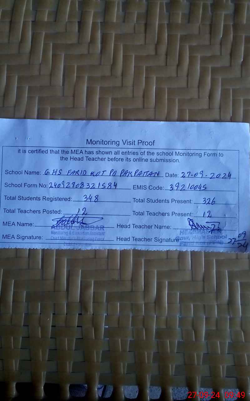| EMIS Code: 39210045 | Name of School: GHS FARID KOT P/O PAKPATTAN | |||